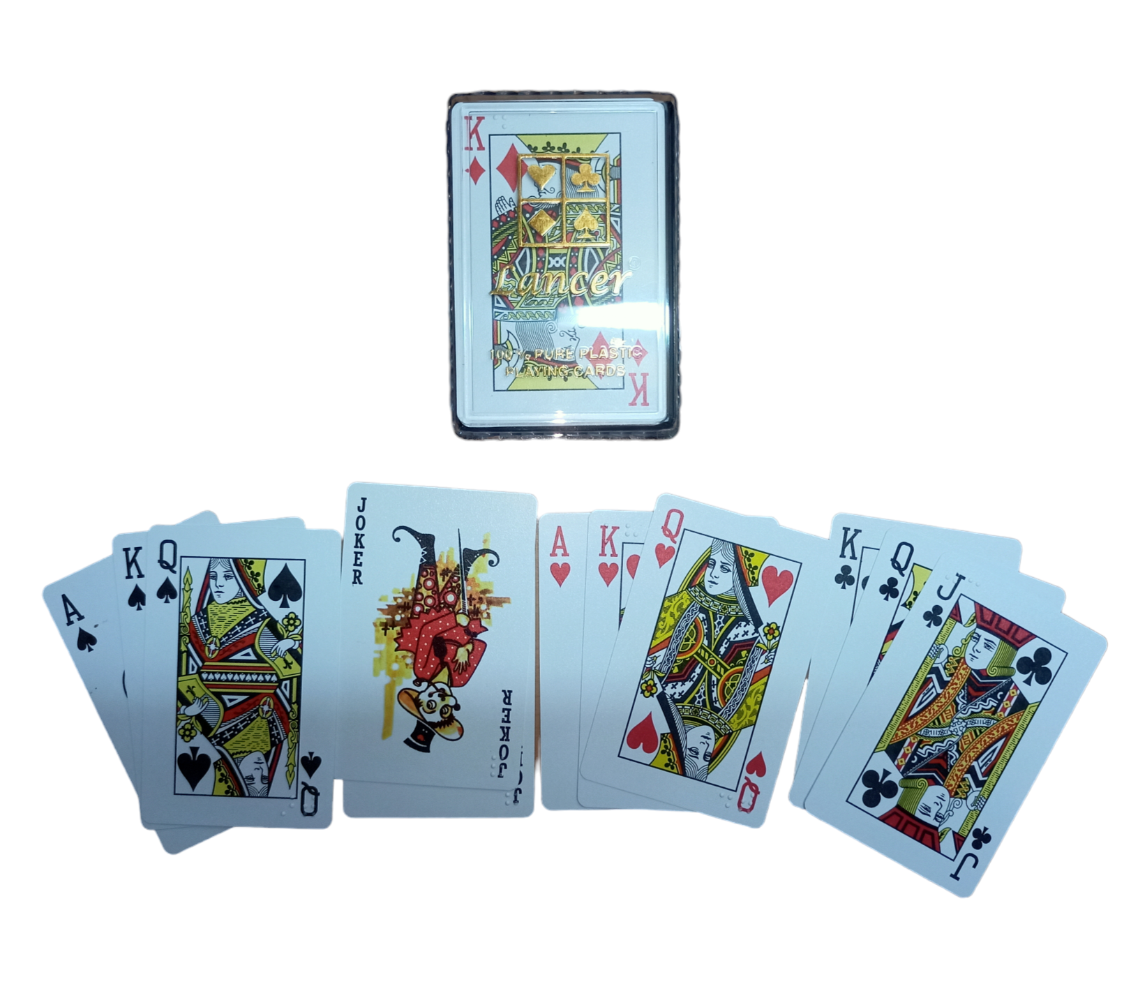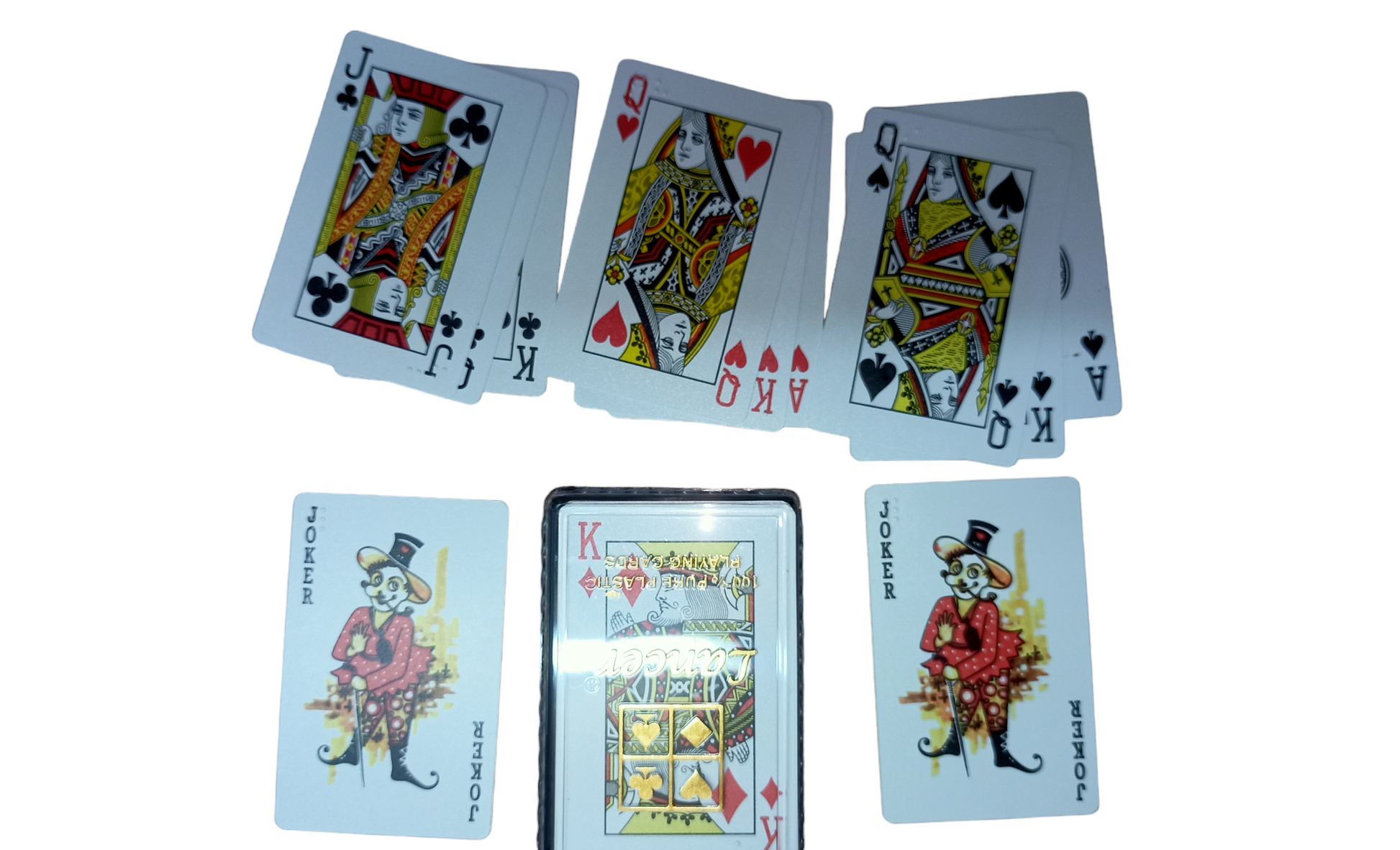 A set of fifty-four playing cards crafted from specially treated card stock, comprising thirteen cards each of four suits along with two jokers. Each card features both printed and Braille text. The embossed section, denoting the number and suit is positioned on the left side. For example, "10 Hearts" is represented as "10 H" and so forth