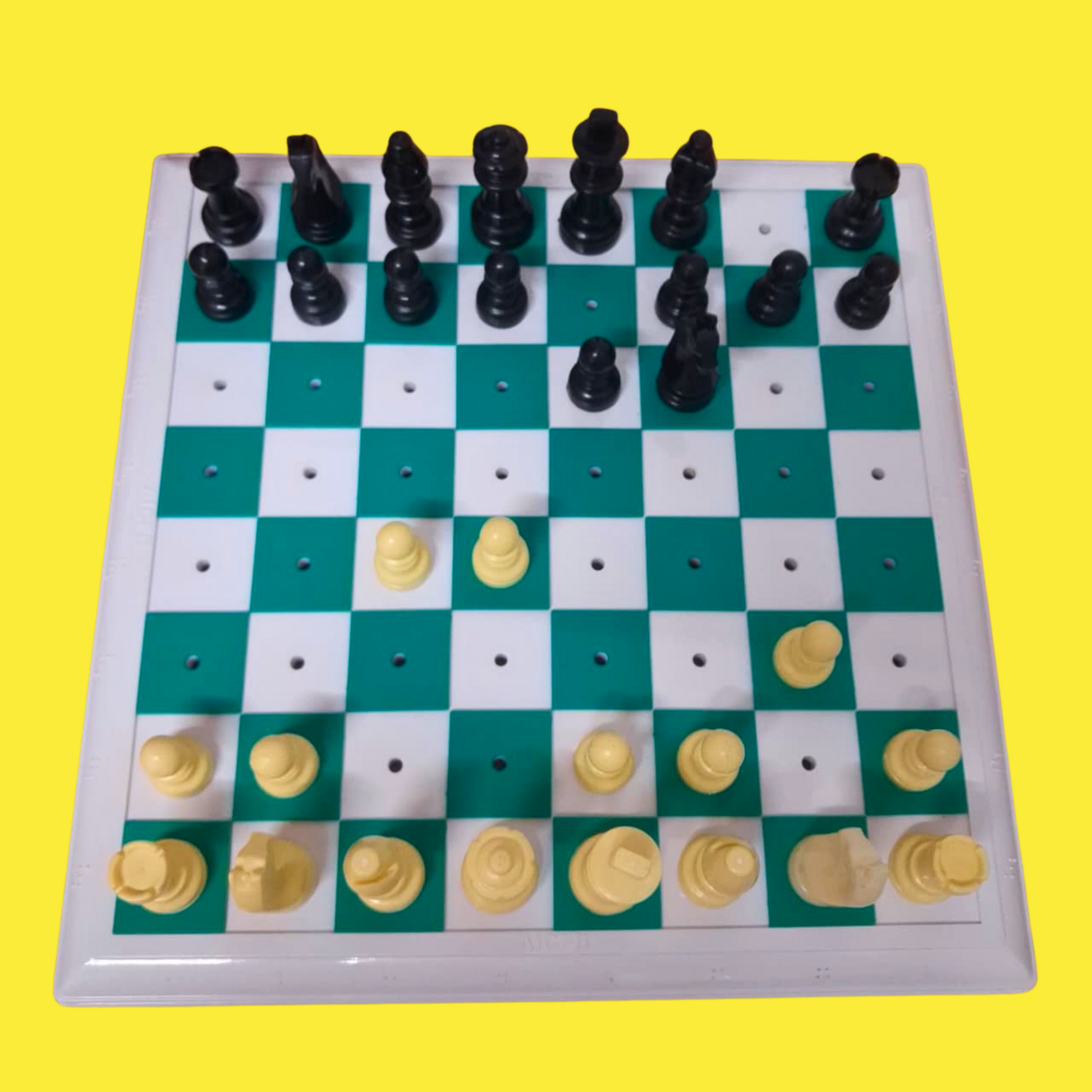 This is an international Braille chessboard made of ABS plastic and wood, featuring white and black pieces. Each square has a hole, and every piece has a peg at the bottom that fits into the hole, helping to keep the pieces in place during the game. The pieces have distinct tactile markings, making them easy to identify by touch. The green and white squares are high-contrast, making the board suitable for players with low vision.